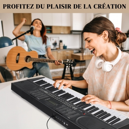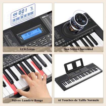 【Fonctions Pratiques】Ce clavier 61 touches dispose d'une double alimentation (adaptateur secteur inclus + 4 piles aa non incluses). La prise casque vous permet de profiter d'une musique immersive sans déranger les autres. Les 3 modes d'apprentissage (modes one-key, follow et ensemble) facilitent l'apprentissage des débutants