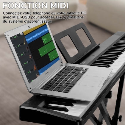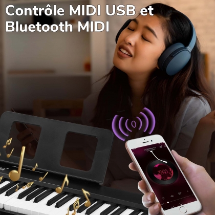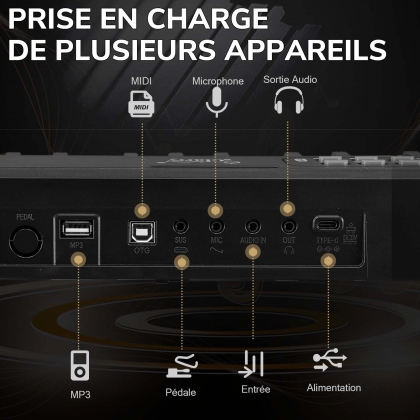 【Double Mode Bluetooth】: Grâce à la fonction Bluetooth MIDI, notre piano à clavier peut se connecter à votre téléphone ou iPad, puis se connecter à des applications, ou se connecter directement à votre PC ou tablette pour un arrangement ou un accompagnement