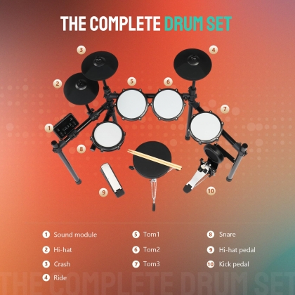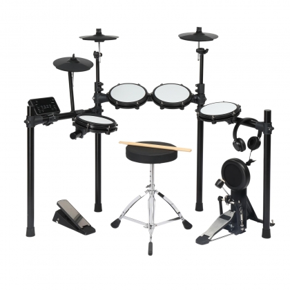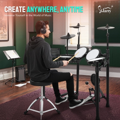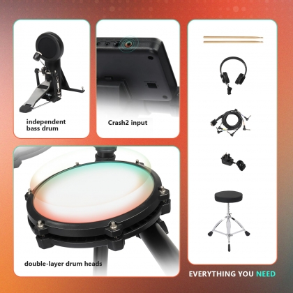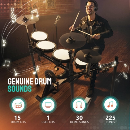 【Kit complet avec accessoires inclus】 : Tout le nécessaire est inclus pour commencer à jouer immédiatement : tabouret, casque et baguettes. Aucun achat supplémentaire n’est nécessaire. Le casque permet une pratique silencieuse afin de ne pas déranger votre entourage.
