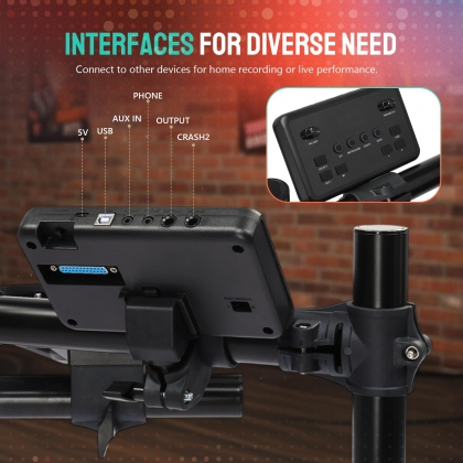 【Connectivité polyvalente】 : Elle dispose de ports USB, AUX IN, PHONE, CRASH2 et OUTPUT, permettant de connecter divers appareils pour l’enregistrement ou l’utilisation de sources audio externes. Cette flexibilité élargit les possibilités d’utilisation, que ce soit pour la pratique ou le divertissement.
